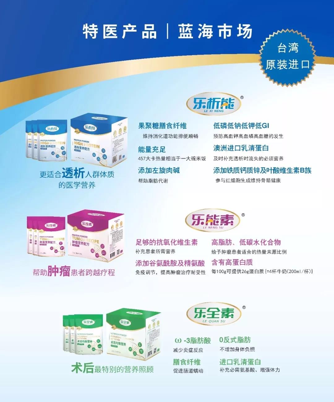 產(chǎn)品均來(lái)自臺(tái)灣進(jìn)口、全營(yíng)養(yǎng)配方、其成分充分根據(jù)患者需求特點(diǎn)配比、包裝質(zhì)美,具有廣闊的市場(chǎng)前景。
