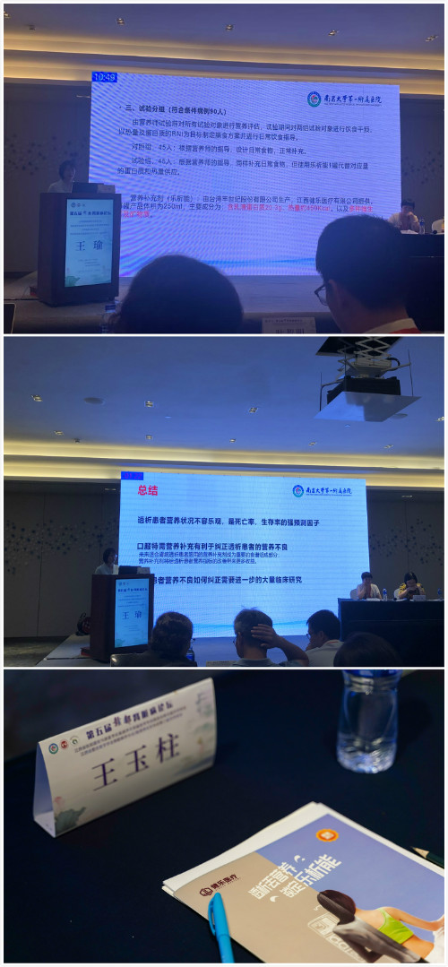 本次大會(huì),我司有幸獲邀參展,并由南昌大學(xué)第一附屬醫(yī)院腎內(nèi)科王瑜副主任醫(yī)師就“樂(lè)析能營(yíng)養(yǎng)治療干預(yù)血液透析患者蛋白質(zhì)能量消耗的作用”進(jìn)行了專題報(bào)告。報(bào)告中指出:通過(guò)多中心臨床實(shí)驗(yàn)證明,樂(lè)析能?有利于改善透析患者蛋白質(zhì)能量消耗問(wèn)題,為透析患者出現(xiàn)的營(yíng)養(yǎng)不良的干預(yù)治療提供了新的途徑。