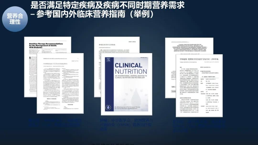 那么同樣地,針對(duì)每一個(gè)臨床疾病,現(xiàn)在國際、國內(nèi)都有一些專業(yè)組織、專業(yè)學(xué)會(huì)會(huì)推薦一些臨床營養(yǎng)指南和臨床營養(yǎng)共識(shí)。這個(gè)是一定要參考的,因?yàn)樵谶@里,每一種疾病情況下,臨床營養(yǎng)指南是對(duì)于包括代謝、康復(fù)等各種情況都有考量的。