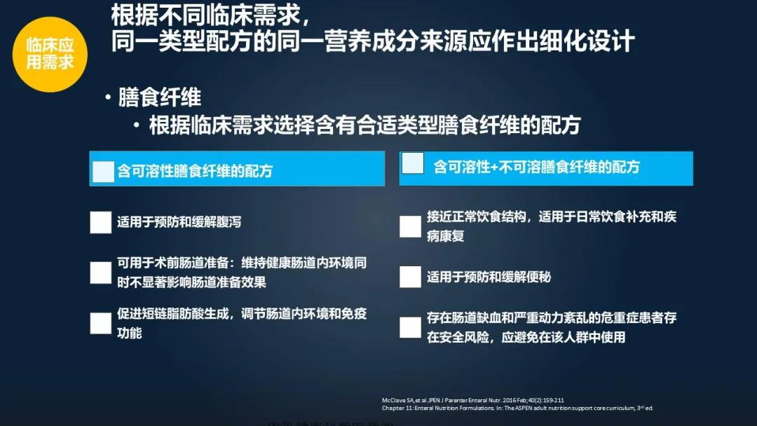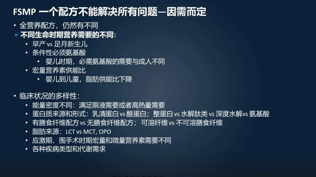 不同年齡段的臨床狀況也不一樣,因?yàn)樗麄円灿胁煌呐R床需要。比如能量密度不同,蛋白質(zhì)來源不同,包括膳食纖維也不同。脂肪來源不同的情況下,比如說中鏈脂肪酸對(duì)他更好,但有一些情況下他代謝不了脂肪。所以在很多情況下,我們一定要注意,不是一個(gè)配方要解決所有的問題,但是要有標(biāo)準(zhǔn)配方,要有組件,要有這種針對(duì)性的設(shè)計(jì)。