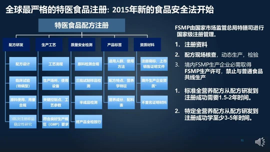 特醫(yī)食品在中國是實(shí)行國家注冊(cè)管理的,目前來講,中國的注冊(cè)是全球最嚴(yán)格的,這是有根據(jù)的——不單單要提交注冊(cè)材料,注冊(cè)材料里包括配方研發(fā)的從設(shè)計(jì)、臨床實(shí)驗(yàn),包括原料的一些合規(guī)、穩(wěn)定實(shí)驗(yàn),包括生產(chǎn)工藝、質(zhì)量安全這些檢測,包括所有的指標(biāo)。這些指標(biāo)是非常龐大的一些內(nèi)容,涉及到你從一個(gè)產(chǎn)品從研發(fā)到生產(chǎn)到終端,整個(gè)進(jìn)行過程中所有的相關(guān)資料,包括你的資質(zhì)。