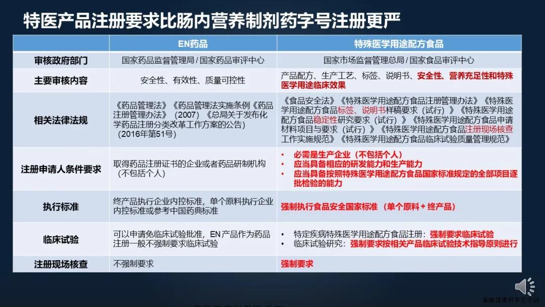 特殊醫(yī)學(xué)用途配方食品跟腸內(nèi)營養(yǎng)制劑去比較的話,有很多方面還要高于它的要求。比如說,現(xiàn)在注冊(cè)特醫(yī)食品,臨床研究是強(qiáng)制性的,現(xiàn)場核查是強(qiáng)制性的,包括這個(gè)生產(chǎn)條件,包括注冊(cè)申請(qǐng)人要求的條件,也是必須達(dá)到相應(yīng)的條件,有前提的,所以這一部分就有很多要求。