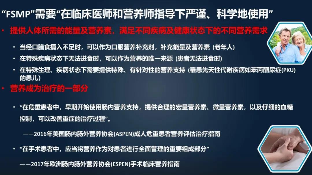 另外,特殊醫(yī)學(xué)用途配方食品現(xiàn)在已經(jīng)成為治療的一部分了。因?yàn)樵谥匕Y病人,在手術(shù)患者中,通過特殊醫(yī)學(xué)用途配方食品的使用,可以全面地改善整個(gè)治療過程。這方面主要是涉及到美國和歐洲的臨床營養(yǎng)專業(yè)指南。