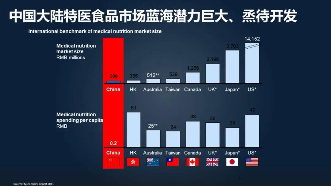 這是麥肯錫在 2011 年的一個(gè)報(bào)告。這個(gè)報(bào)告里,大家可以看看國外的這些國家,它的特醫(yī)食品的使用量都是很高的。2011 年,每個(gè)人平均特醫(yī)食品的使用大概都是五六十塊錢到幾百塊錢,而咱們國家平均每個(gè)人只有兩毛錢。