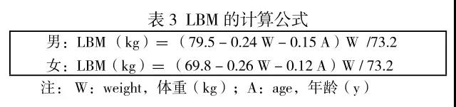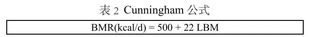 1980 年 Cunningham JJ 利用 Harris JA 及 Benedict FG 的 239 例受試者的原始數(shù)據(jù),排除 16 例運(yùn)動(dòng)員的數(shù)據(jù)后,回歸分析發(fā)現(xiàn) LBM 是基礎(chǔ)代謝率(basal metabolic rate,BMR)的唯一顯著有效預(yù)測(cè)因素,年齡、性別、身高及體重均是 LBM 的影響因素,與 BMR 無(wú)明顯直接關(guān)系。因此,得出基于 LBM 的公式如表 2。
