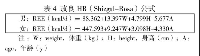 鑒于 HBE 的缺陷,1984 年 Roza AM 及 Shizgal HM 用 Harris JA 及 Benedict FG 當(dāng)年的原始數(shù)據(jù)結(jié)合新的數(shù)據(jù),對(duì)原始 HBE 進(jìn)行了重新評(píng)價(jià)與修訂,改良后的 HBE 如表 4,又稱(chēng)為 Shizgal-Rosa 公式。研究發(fā)現(xiàn),該公式與實(shí)際能量消耗更加接近,更加準(zhǔn)確。在 1990 年 The Mifflin-St Jeor 公式出現(xiàn)之前,Shizgal-Rosa 方程式是最為準(zhǔn)確的 REE 預(yù)估公式。