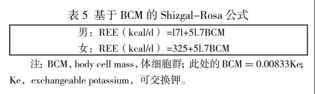 在對(duì)體重、身高、年齡、性別及體細(xì)胞群(bodycell mass,BCM)進(jìn)行綜合分析后,Roza AM 及 Shizgal HM 發(fā)現(xiàn),傳統(tǒng) HBE 的年齡、性別、身高及體重 4 個(gè)變量實(shí)際上都與 BCM 密切相關(guān),或者說(shuō)可以由 BCM 替代,所以,他們又提出了基于 BCM 的另外一個(gè) REE 計(jì)算公式,如表 5。