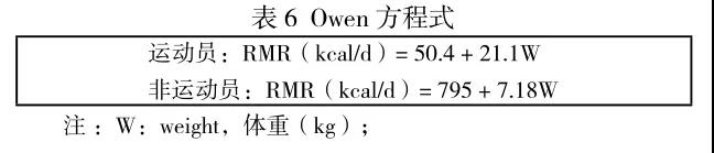 1986 年 Owen OE 等用間接測(cè)熱法測(cè)量了 44 例 18~65 歲,體重 43~143 kg 健康女性的能量消耗,其中有 8 位運(yùn)動(dòng)員。多因素回歸分析發(fā)現(xiàn),只有體重與 RMR 關(guān)系最為密切,而且運(yùn)動(dòng)員與非運(yùn)動(dòng)員有顯著差別。由此,他們建立了 Owen 方程式,見(jiàn)表 6。