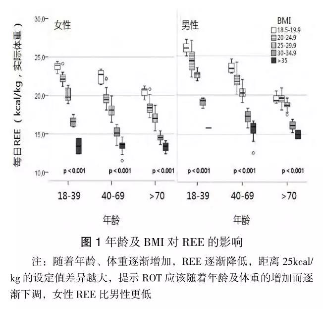 隨著體重增加,ROT 值應(yīng)該下調(diào),因?yàn)樵黾拥捏w重是脂肪組織,而脂肪組織是非活躍器官。Zauner A 等建議對(duì)體重正常、超重、肥胖、病態(tài)(嚴(yán)重)肥胖患者分別使用 25kcal/kg、22kcal/kg、20kcal/kg、16kcal/kg 計(jì)算其 REE。同樣,隨著年齡的增加,成年后每 10 年 REE 下降 1%~2%,ROT 也應(yīng)該下調(diào),因?yàn)榧∪庵饾u減少,而脂肪組織的比例相對(duì)升高。