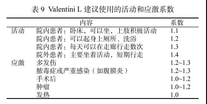 Valentini L等對(duì) 5 家醫(yī)院 676 例連續(xù)入院患者用 HBE 計(jì)算其 REE,發(fā)現(xiàn)即使采用理想體重計(jì)算,ROT 的 25kcal/kg 也高估了 95% 患者的能量需求,而且隨著年齡增加、隨著體重增加,其高估值越大,而且還有顯著的性別差異,圖 1。有鑒于此,ESPEN 2009 指南推薦 25kcal/kg 是患者的 TDEE,而不是 REE,只有在極少數(shù)嚴(yán)重應(yīng)激狀態(tài)下,才需要 30kcal/kg 。Valentini L 等還建議,創(chuàng)傷、疾病等應(yīng)激條件下計(jì)算 TDEE 時(shí),根據(jù)年齡、性別及體重調(diào)整后的 REE 應(yīng)該乘以應(yīng)激系數(shù),但是主張降低傳統(tǒng)的應(yīng)激系數(shù)數(shù)值,將系數(shù)根據(jù)應(yīng)激輕、中、重分為 1.1、1.2 及 1.3 三個(gè)等級(jí),見(jiàn)表 9。