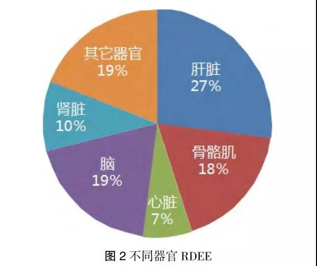 根據(jù)代謝率不同,人體組成可以分為8個(gè)部分,即腦、心、肝、腎、骨骼肌、骨骼、脂肪組織及其他組織,其能量需求(消耗)各不相同,骨骼為 2.3kcal/(kg?d),骨骼肌為 14.5kcal/(kg?d),脂肪組織為 13kcal/(kg?d),腎臟、心臟為 440kcal/(kg?d),腦 240kcal/(kg?d),肝臟 200kcal/(kg?d)。腦、肝、心、腎盡管占全部體重不足 6%,但是其總能量消耗占 REE 的 60%~70%,骨骼肌盡管占全部體重的 40%~50%,但是其能量消耗只占 REE 的 20%~30% 。不同器官組織的耗能比例見(jiàn)圖 2。