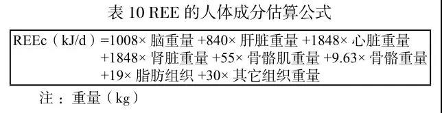 根據(jù)不同組織、器官的代謝率,Elia?M 提出了一個(gè) REE 計(jì)算(Calculation?of?REE,REEc) 公式,見(jiàn)表 10。
