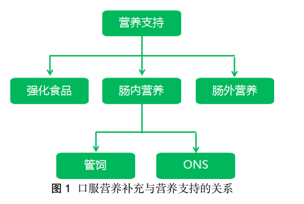 目前文獻中的關(guān)于口服營養(yǎng)補充(ONS)的英文表述并不十分統(tǒng)一,根據(jù)ESPEN 2006年發(fā)表的對于腸內(nèi)營養(yǎng)的各個專有名詞的使用規(guī)范,ONS的英文全稱統(tǒng)一規(guī)范為“oral nutritional supplements”,其定義為:“除了正常食物以外,用特殊醫(yī)學(xué)用途(配方)食品經(jīng)口攝入補充日常飲食的不足”。ONS 通常是液態(tài)食品,也可以是粉末狀、零食條或者其他類型。在醫(yī)學(xué)文獻中的同義名詞為“sip seeds”。因此,從這個意義上講,ONS屬于營養(yǎng)支持中的腸內(nèi)營養(yǎng)的一個分支(如圖1)。