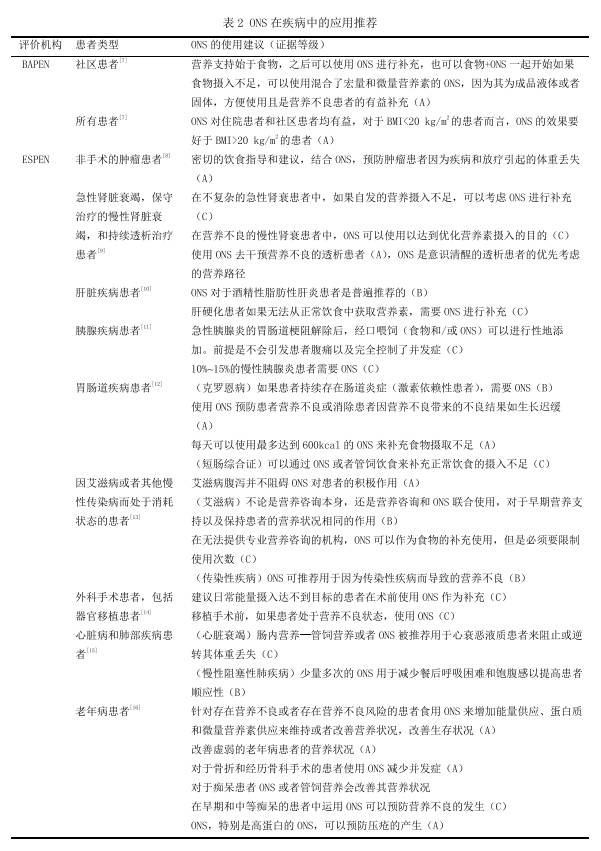 2007年,Stratton?RJ和Elia?M對ESPEN和BAPEN發(fā)表的各類指南中關(guān)于ONS的使用進行了小結(jié)(表2),指出了各類疾病患者使用ONS的意義以及相關(guān)的證據(jù)等級。