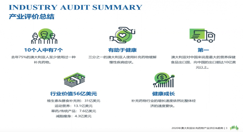 對澳大利亞的2020年產(chǎn)業(yè)報(bào)告作了總結(jié):過去十年維生素和膳食補(bǔ)充劑的產(chǎn)品品類銷售量增長了近一倍,其中女性消費(fèi)者購買的頻率高于男性消費(fèi)者。增長最快的產(chǎn)品成分包括:益生菌、月見草油、鈣和輔酶Q10。澳大利亞的膳食補(bǔ)充劑產(chǎn)品的出口量領(lǐng)先世界,并且銷量呈增長趨勢,其中中國占最大市場份額,亞洲的中產(chǎn)階級和人口老齡化的增漲趨勢將預(yù)計(jì)會推動澳大利亞膳食補(bǔ)充劑產(chǎn)品的出口。隨著行業(yè)的不斷提升,在送貨方式、包裝、口味、成分以及配方等方面需要不斷的進(jìn)行創(chuàng)新。