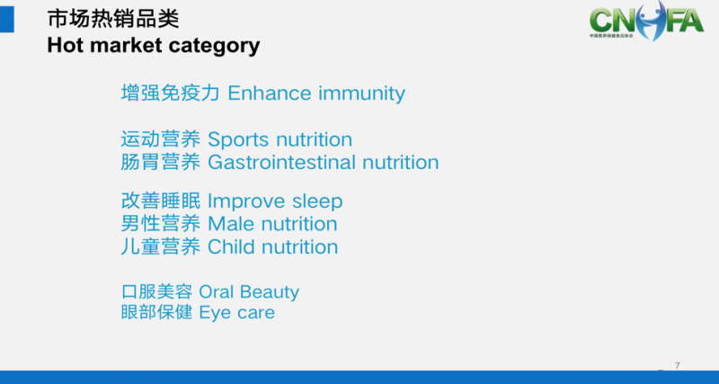 保健食品的新關(guān)注:更高水平的營養(yǎng)、消費(fèi)者對特殊營養(yǎng)的需求。針對營養(yǎng)和社會彈性方面展開更多的科學(xué)和政策研究工作;膳食補(bǔ)充劑的市場呈增長的趨勢尤其是在線銷售模式,并且膳食補(bǔ)充劑迎來了更多新的消費(fèi)者。