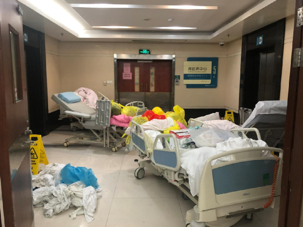 下午2時許,該院6號樓已解封,B區(qū)設有腎臟病中心與肝膽胰外科中心?!搬t(yī)學界”觀察到,事發(fā)的5層為血液凈化中心1區(qū)(下簡稱血透1中心區(qū)),電梯口外堆放了四張病床和部分床單,場面凌亂不堪。一小時后,兩張病床被清理。